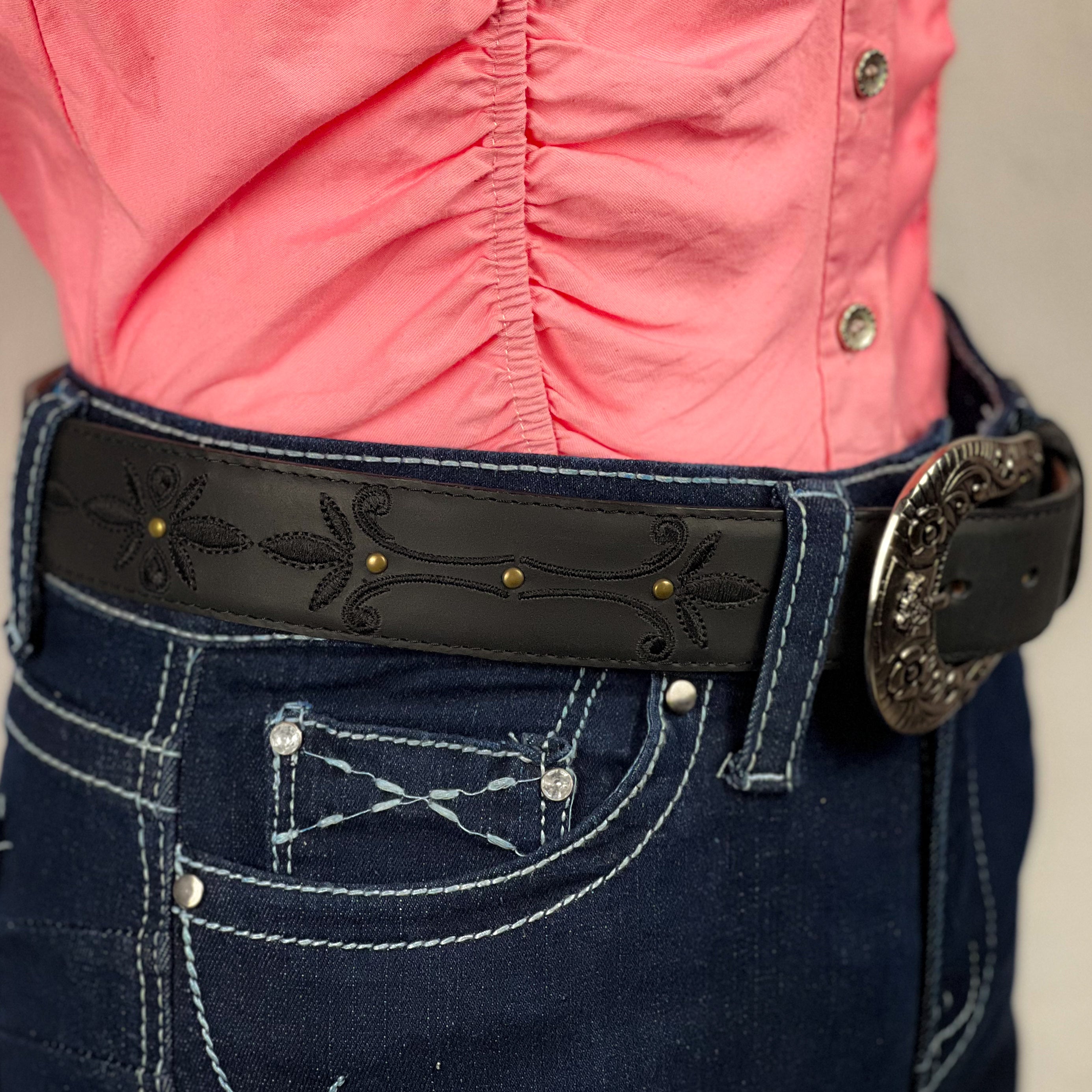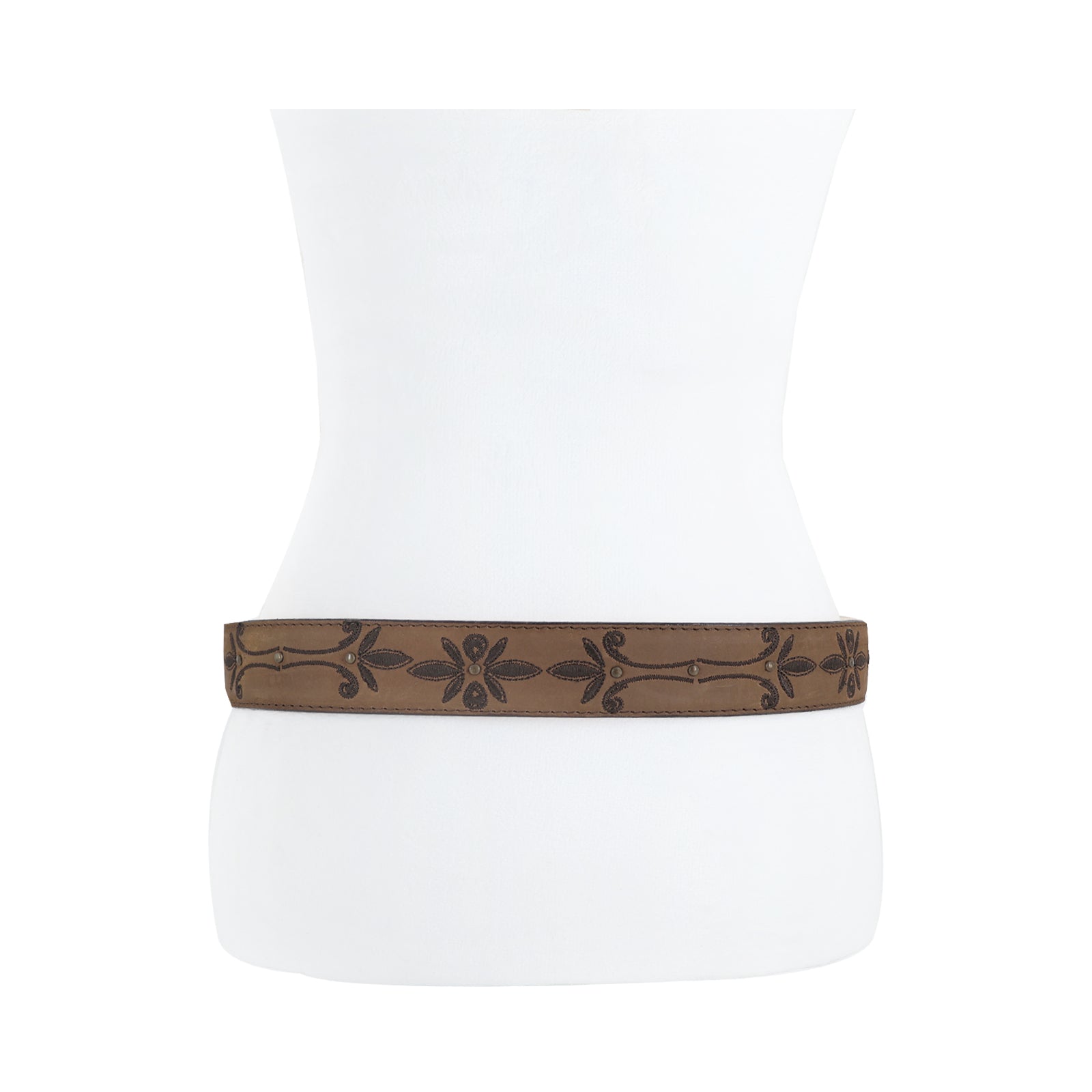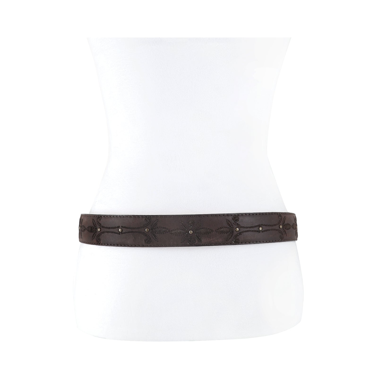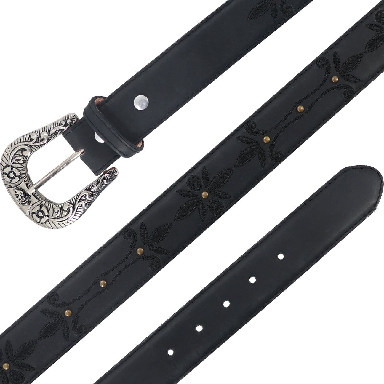 Cinturón para dama en piel de res con diseño de flores bordado y con diseño de estoperoles.