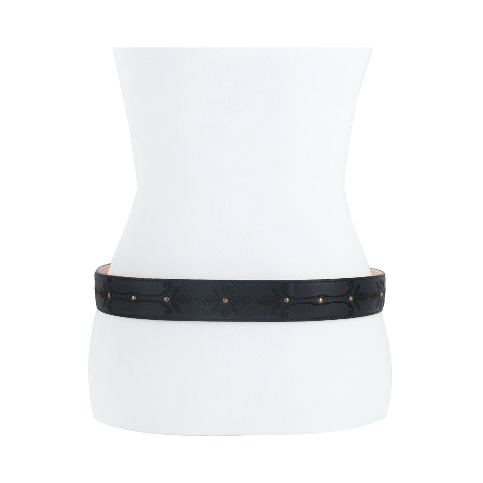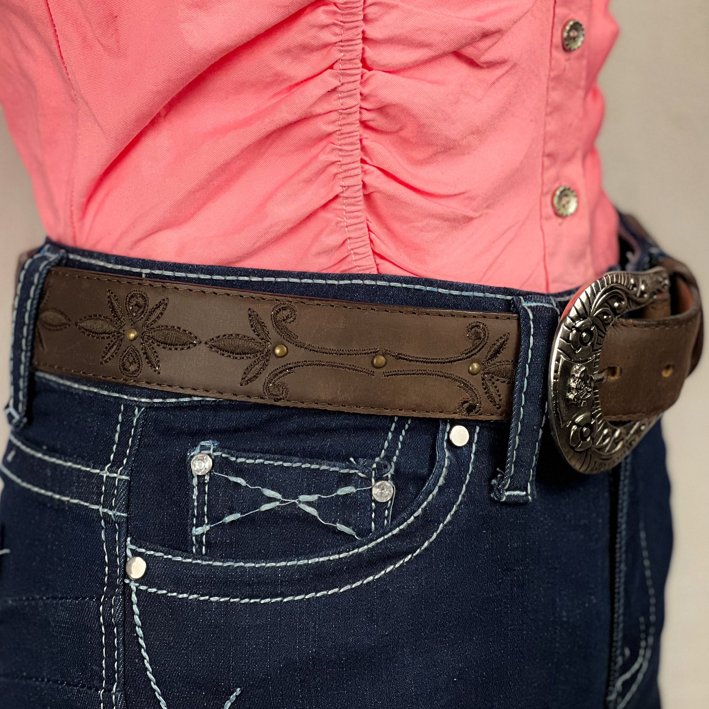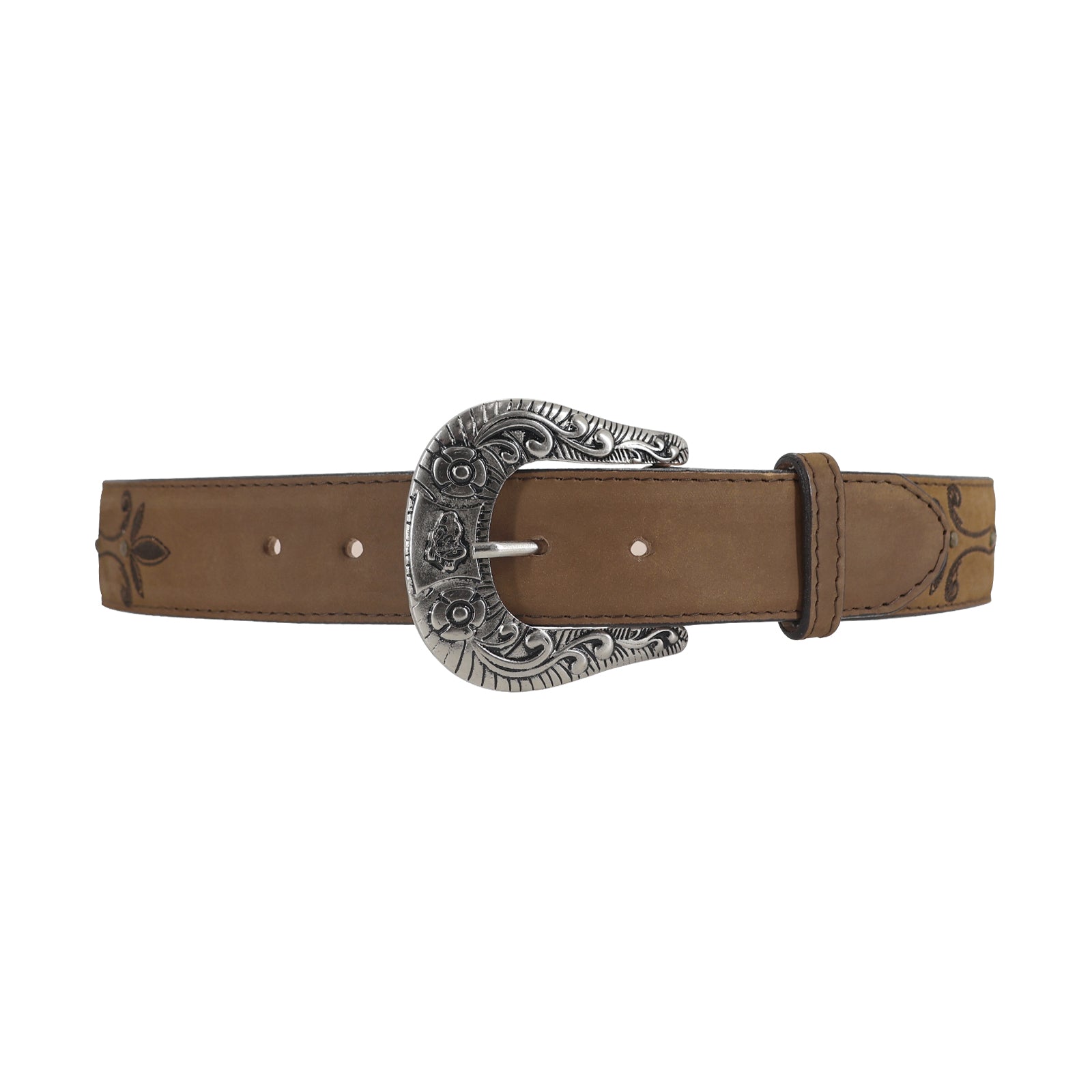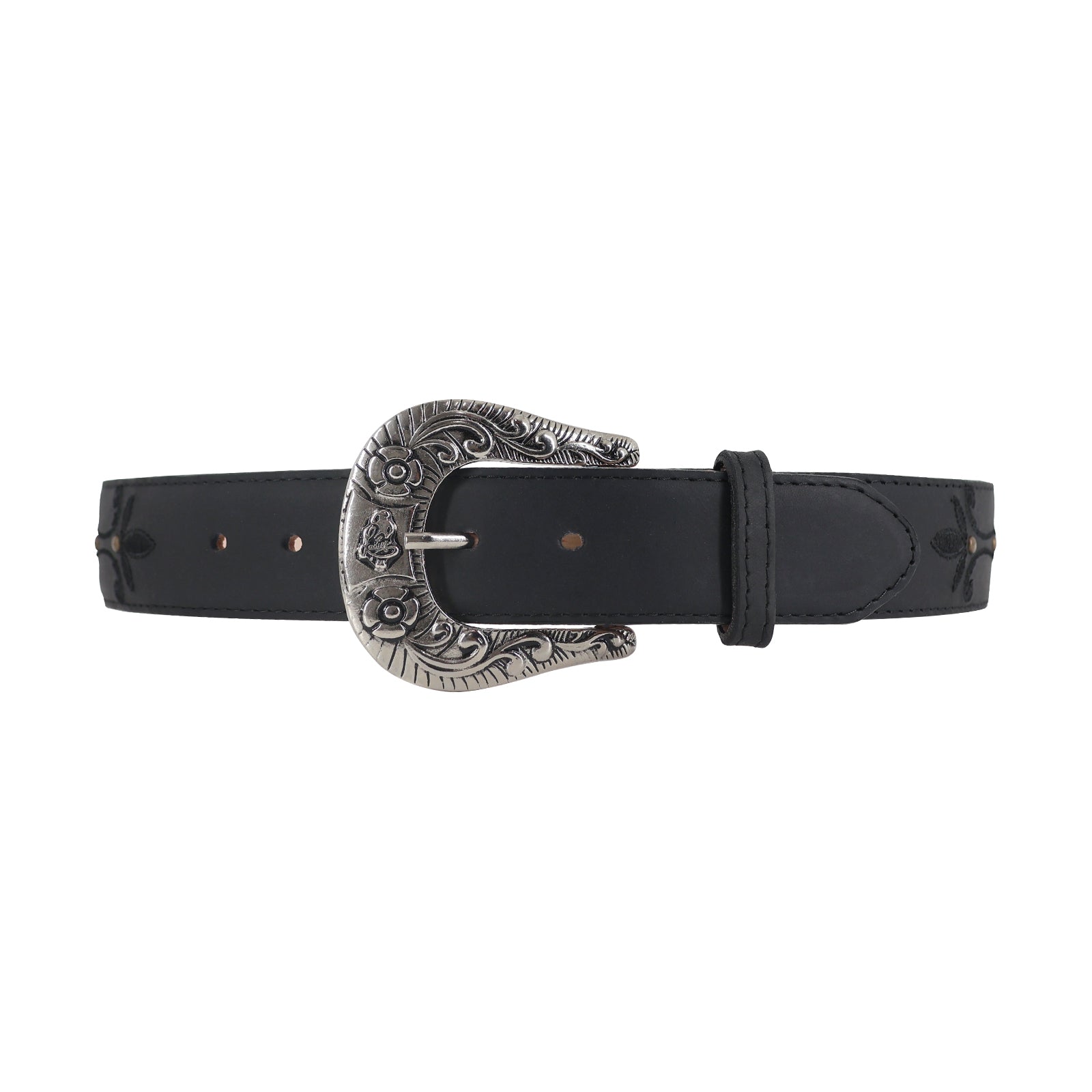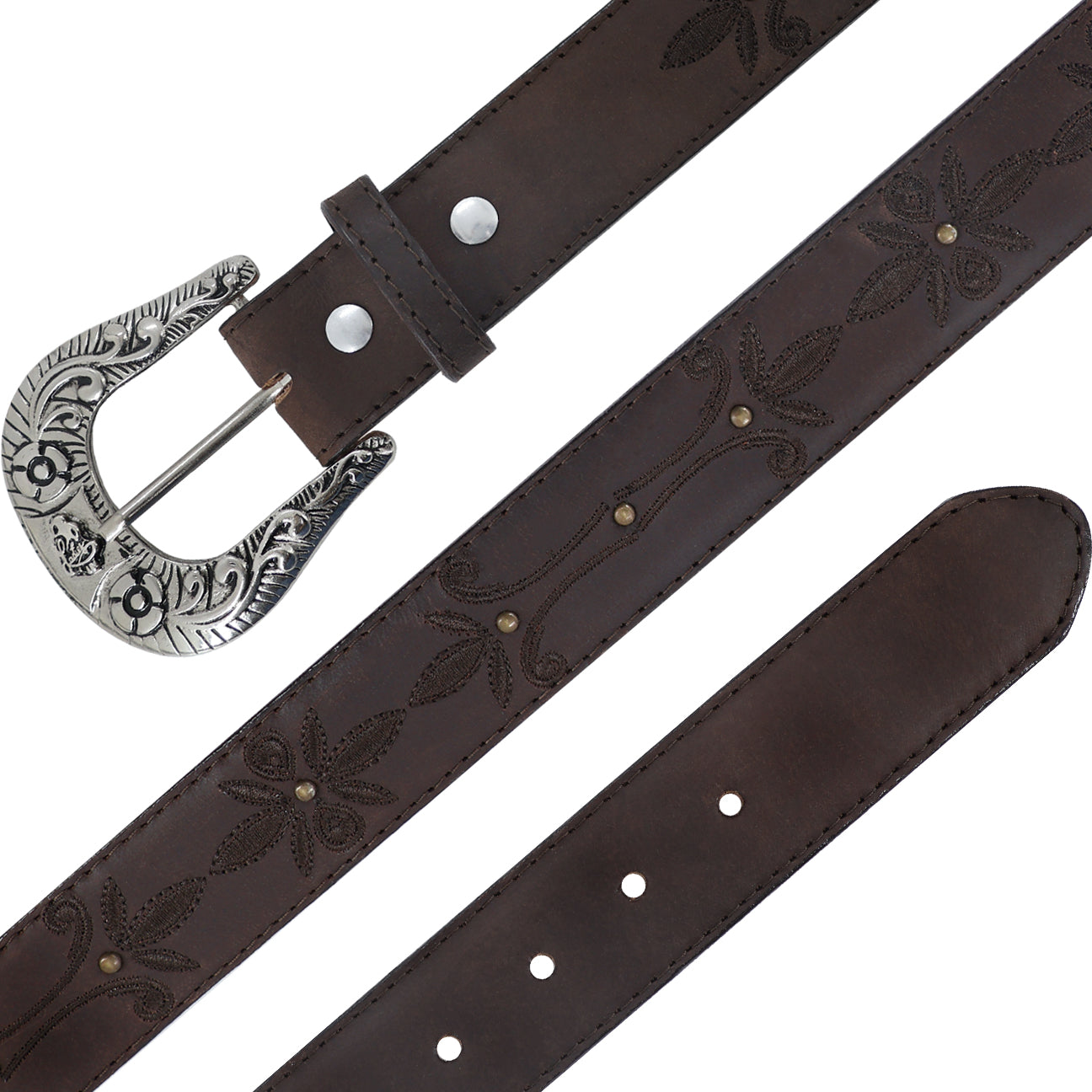 Cinturón para dama en piel de res con diseño de flores bordado y con diseño de estoperoles.