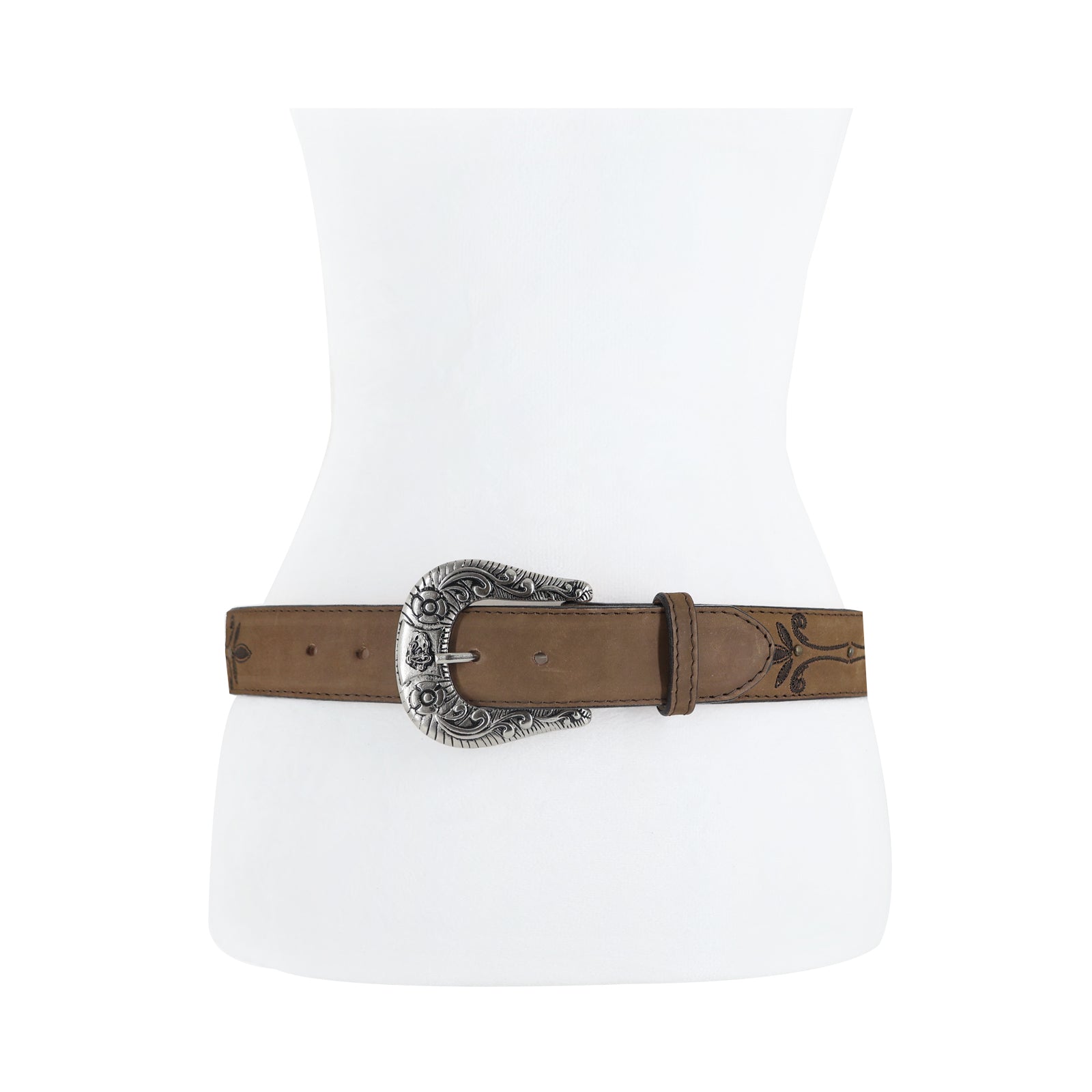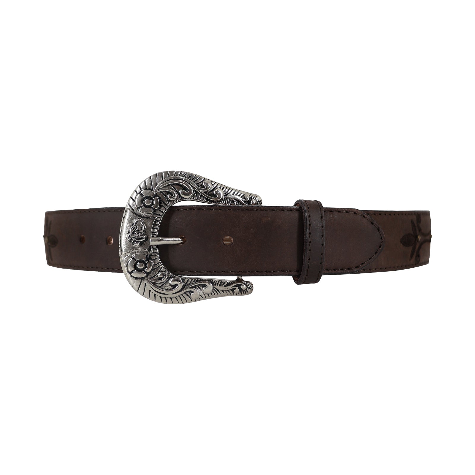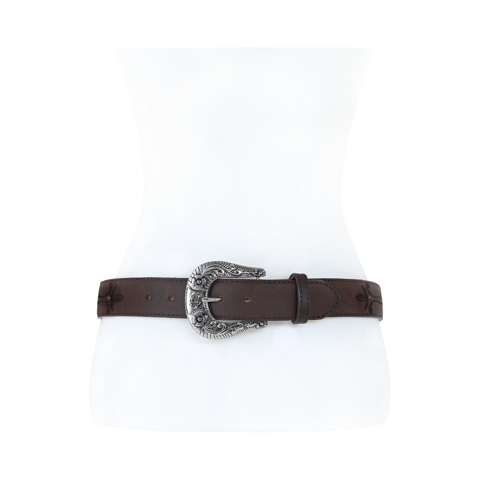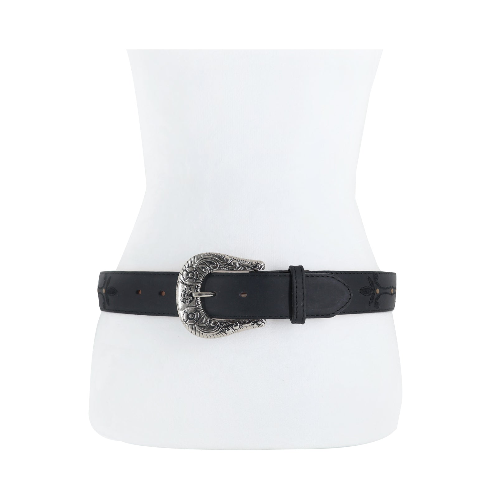 Cinturón para dama en piel de res con diseño de flores bordado y con diseño de estoperoles.
